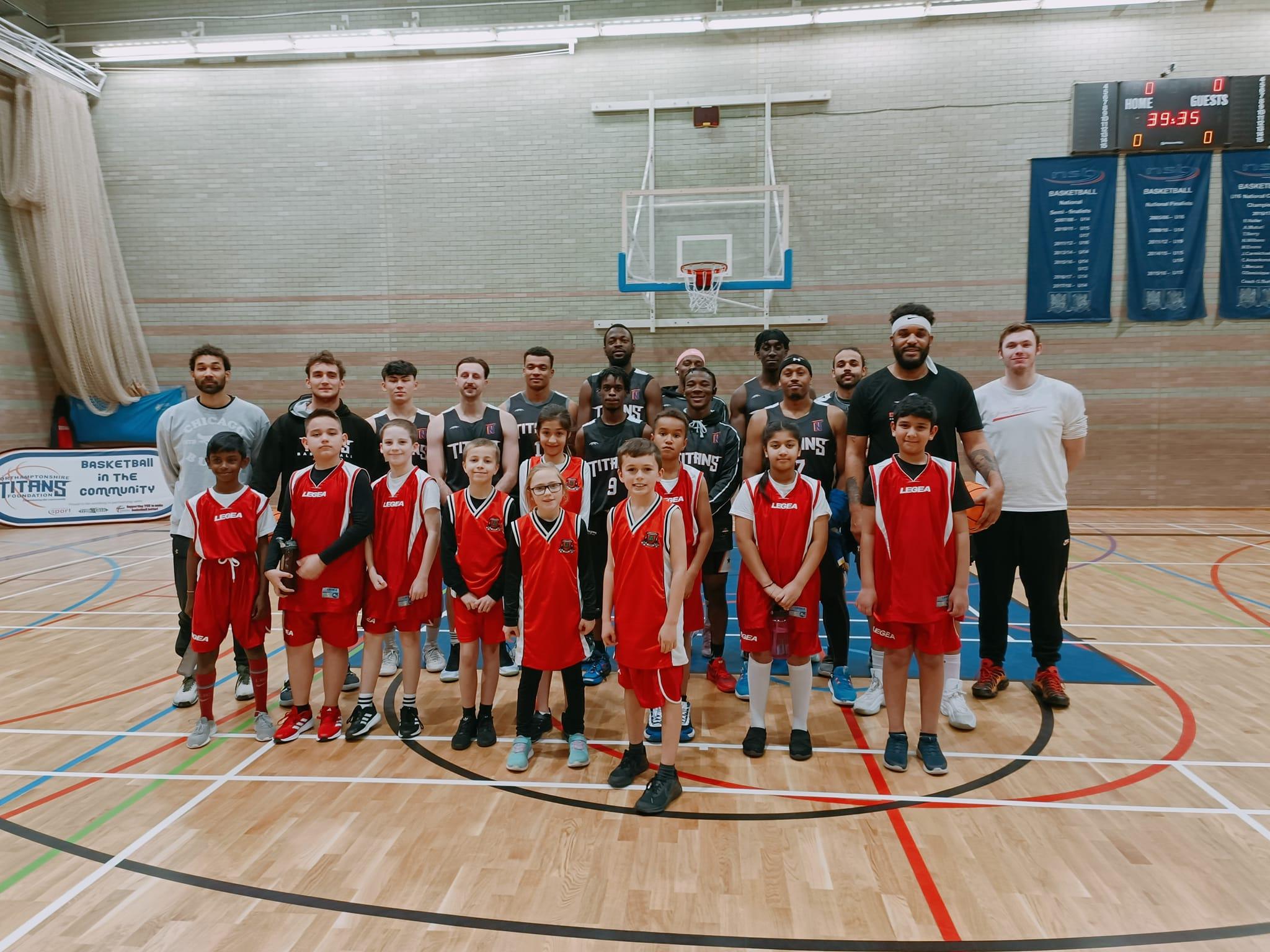 The school basketball team plays at half time during a match between Northamptonshire Titans and Bristol